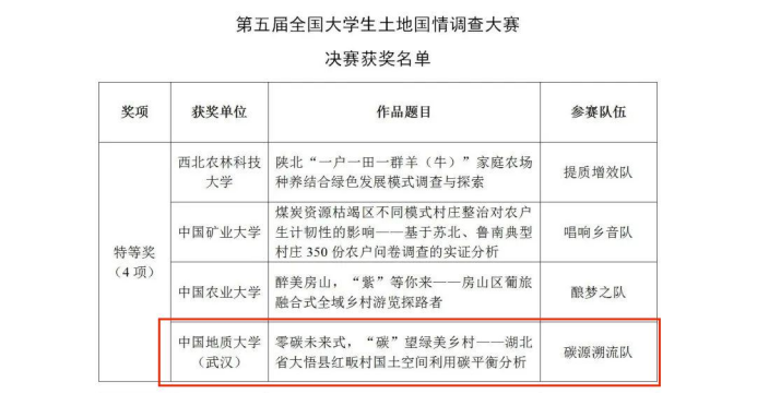 11月4日,由教育部高等学校公共管理类专业教学指导委员会主办、中国土地学会指导、西北农林科技大学承办的第五届全国大学生土地国情调查大赛决赛在陕西杨凌成功落下帷幕。本届大赛以“国土空间利用与和美乡村建设”为主题,吸引来自全国85所高校的191支队伍参加,最终49支队伍晋级决赛。由太阳成徐枫教授和经管学院金贵教授共同指导的学生团队在激烈的竞争中脱颖而出,参赛作品《零碳未来式,“碳”望绿美乡村——湖北省大悟县红畈村国土空间碳平衡分析》荣获全国特等奖。