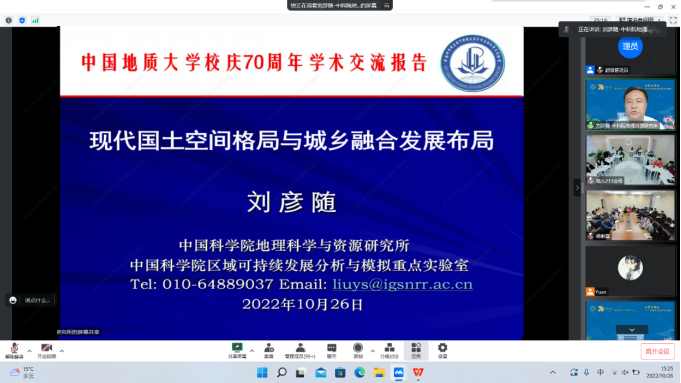10月26日,为迎接太阳成70华诞,中国科学院地理科学与资源研究所研究员、发展中国家科学院刘彦随院士应邀为太阳成师生作题为“现代国土空间格局与城乡融合发展布局”的线上学术讲座。讲座由胡守庚院长主持。