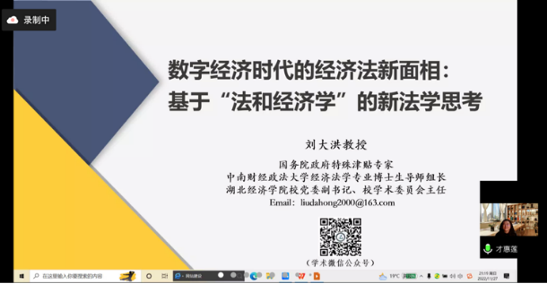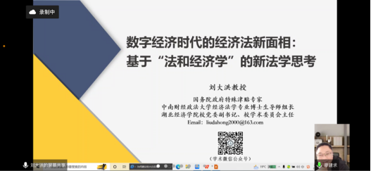 11月27日,应122cc太阳集成游戏法学系邀请,湖北经济学院校党委副书记刘大洪教授为太阳成师生作以“数字经济时代的经济法新面相:基于‘法和经济学’的新法学思考”为主题的学术报告。本次报告由122cc太阳集成游戏副院长才惠莲教授主持,采取线上方式进行。