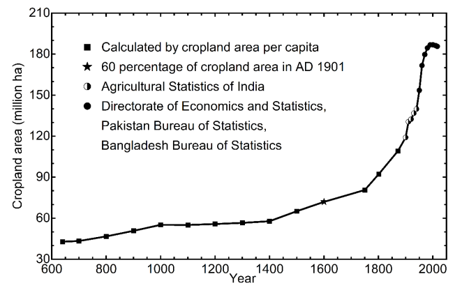 在综述论文的基础上,李老师团队进一步估算了南亚过去一千多年的耕地面积。首先,基于大量的历史记载和前人研究,估算了南亚过去千余年的历史人口;然后,通过若干时间节点上较为可靠的历史档案计算出南亚公元640–1871年的人均耕地面积。继而,通过将历史人均耕地面积与人口估计值相乘,并将其与政府土地利用统计资料相结合,得到了南亚公元640至2016年耕地面积序列。