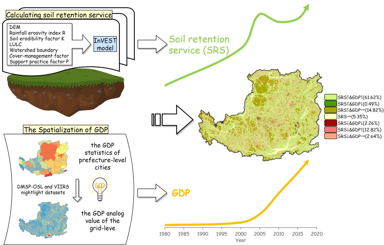 本文利用InVEST模型对1980—2018年中国黄土高原土壤保持服务进行评价,又基于夜间灯光数据集对GDP统计数据开展空间化分析,进而明确了土壤保持服务与经济发展的空间变化关系。研究方法对于大尺度生态与经济之间的关系研究具有一定的借鉴意义。研究结果直接反映了可持续发展战略的优势、区域产业结构调整的趋势以及国家政策导向的重要性。