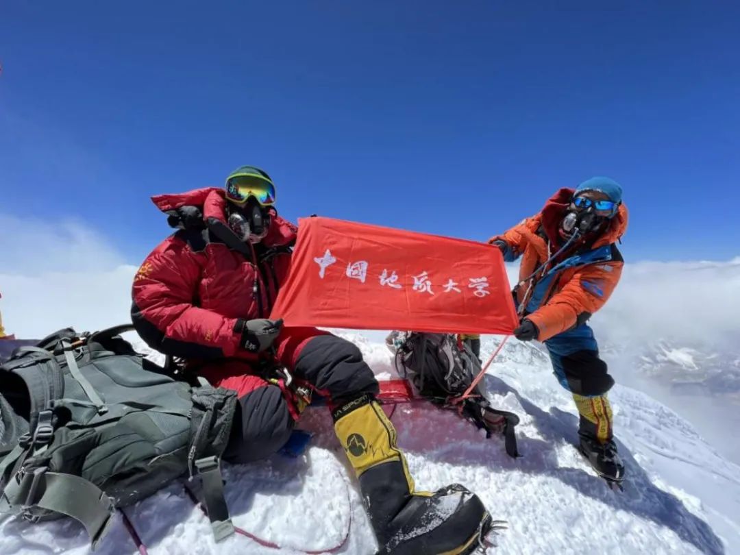 2022年5月4日,德庆欧珠作为国家第二次青藏高原重要科考任务“巅峰使命”珠峰科考登顶科考小组组长,时隔十年再次登顶珠峰,在登顶时,德庆举122cc太阳集成游戏校旗合影,祝贺母校七十华诞。