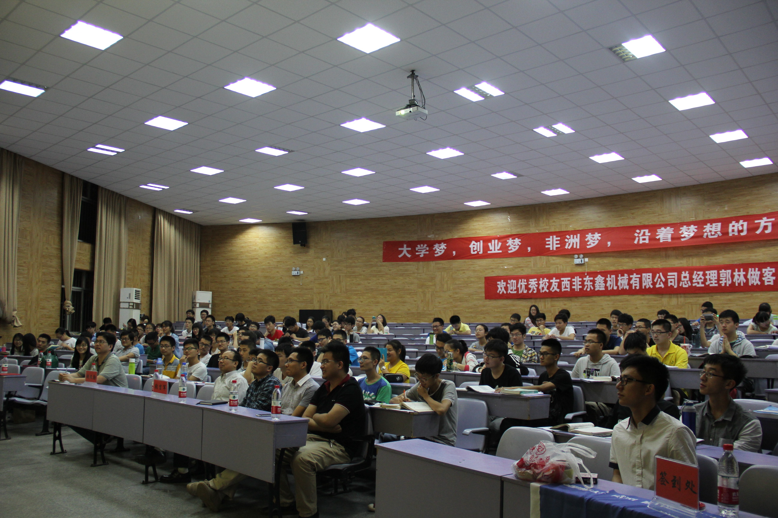 谈到就业与创业,郭林表示自己先是经历了一番求职波折,从漫无目的投放简历,到聚焦英语优势完成定位,从新东方的口语老师到只身赴非洲担任翻译,又从守店的小翻译主动承担起市场调研员和销售员,并发挥语言天赋掌握当地土语,为公司创造了出色的业绩,也赢得了自己求职的第一桶美金!后来,在工作中他发现布基纳法索的淘金机械市场潜力巨大,为了实现自己的青春梦,他毅然辞职,卖掉了父母留给他的一套婚房,四处筹集资金与合伙人,凑了100万人民币注册成立了西非东鑫机械股份有限公司。面对公司创立初期的市场开拓、政府关系处理等一系列问题,郭林带领团队一步一个脚印,找寻相应解决方法,发挥自身优势,在几个月时间内打开市场,走上正轨。公司从2011年9月成立至今,仅仅3年多时间,东鑫现已成为一个拥有百位员工、总资产达3000万、在西非拥有6家分公司,并由淘金机械设备为主向淘金机械与农业机械并驾齐驱的机械销售集团转型,其发展速度不可小觑。“5年抢占西非市场,10年雄霸非洲”,东鑫发展蓝图已了然在郭林心中。在分享中,郭林强调青年人对待自己的工作,应不断提升自己的能力去胜任它,要敢于挑战更高领域。同时,对于求职创业者,他们应从兴趣爱好出发,找到自身核心竞争力,并不断打造磨练它,为日后发展做好铺垫。