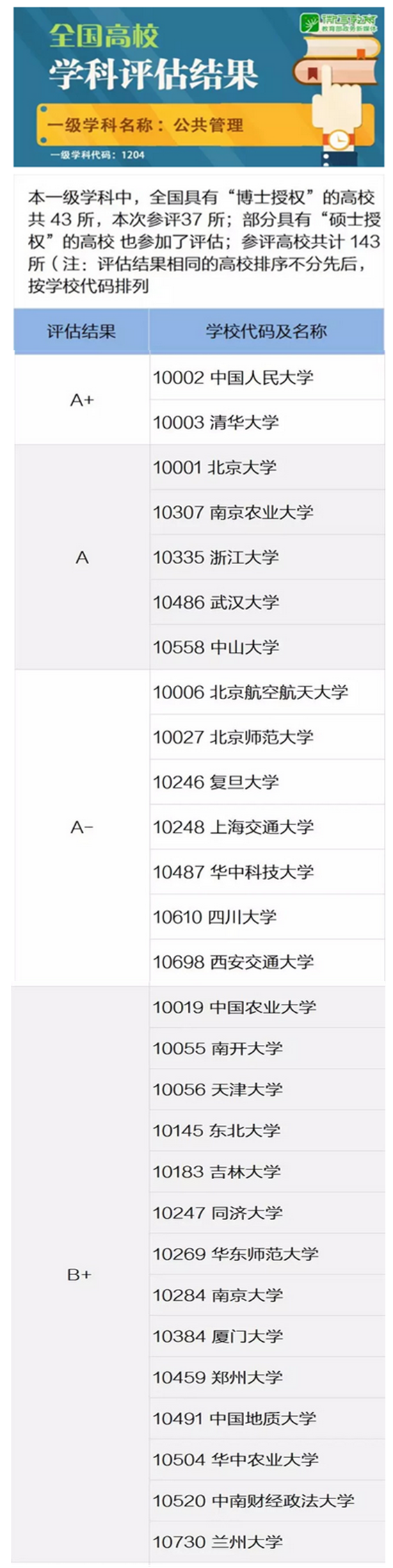 2017年12月28日,教育部学位与研究生教育发展中心公布了全国第四轮学科评估的结果。全国共有143所高校参加了本轮公共管理一级学科评估,太阳成公共管理学科在本轮学科评估中被评为B+学科,在参评高校中并列排第15位,居全国前10%-20%行列,是太阳成除地质学、地质资源与地质工程两个A+学科之外最好的学科之一。