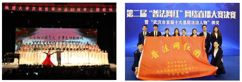 七、兴趣特长展示:2018年,学院法律协会荣获2018年学校“十佳社团”。学院主持人社“我与诗歌有故事”朗诵大赛、胶典摄影队第二届“胶典杯”摄影大赛、法律协会模拟法庭顺利入选学校第十九届大学生文化艺术节青年文化旅行社导游团。学院学子2017级林泽阳等同学参演太阳成原创话剧“大地之光”。学院荣获学校“纪念改革开放40周年”主题歌咏比赛“最佳表演奖”。学院辩论队荣获华中地区“政管杯”辩论赛冠军。荣摘第二届全国“普法网红”网络直播大赛(辩论赛选拔赛)桂冠,2018级硕士生赵淼峰、2016级本科生任雨晴荣膺“武汉市普法形象大使”。