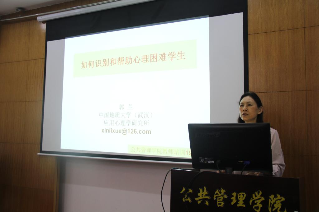 随后,郭老师从自我觉察及他人观察两个方面列举了对心理困扰的自我与他人心理问题的观察判别标准,并对心理问题的成因与容易产生心理问题的学生群体进行了总结并对产生心理问题的原因进行了分析,对于大学生容易出现的一些心理困扰也做了归类讲解,同时她也告诉提醒班主任老师们应积极关心关注同学们日常学习生活,对于出现心理困难的同学应该理解帮助,陪伴左右,如果有需要,应该在第一时间联系校内外心理老师。她向各位班主任老师介绍了十种识别学生心理危机的办法,并强调心身疾病、心理危机、心理创伤是有心理问题的学生自杀的高危因素,应尽早发现并采取有效措施预防,以帮助同学们他们健康成长。