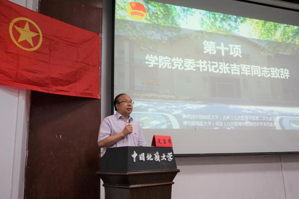 院党委书记张吉军讲话,他对大会的召开表示热烈的祝贺。他指出学院各级团学组织在上级团组织和院党委的领导下,认真履行引领凝聚青年、组织动员青年、联系服务青年的职责使命,团结带领学院团员青年为建设卓越公管、和谐公管、幸福公管开展了富有特色和成效的工作,并对表现突出的个人和集体提出表扬。他向广大代表提出认真履行职责,当好桥梁纽带;树立远大理想,热爱伟大祖国;练就过硬本领,勇担时代责任的要求。