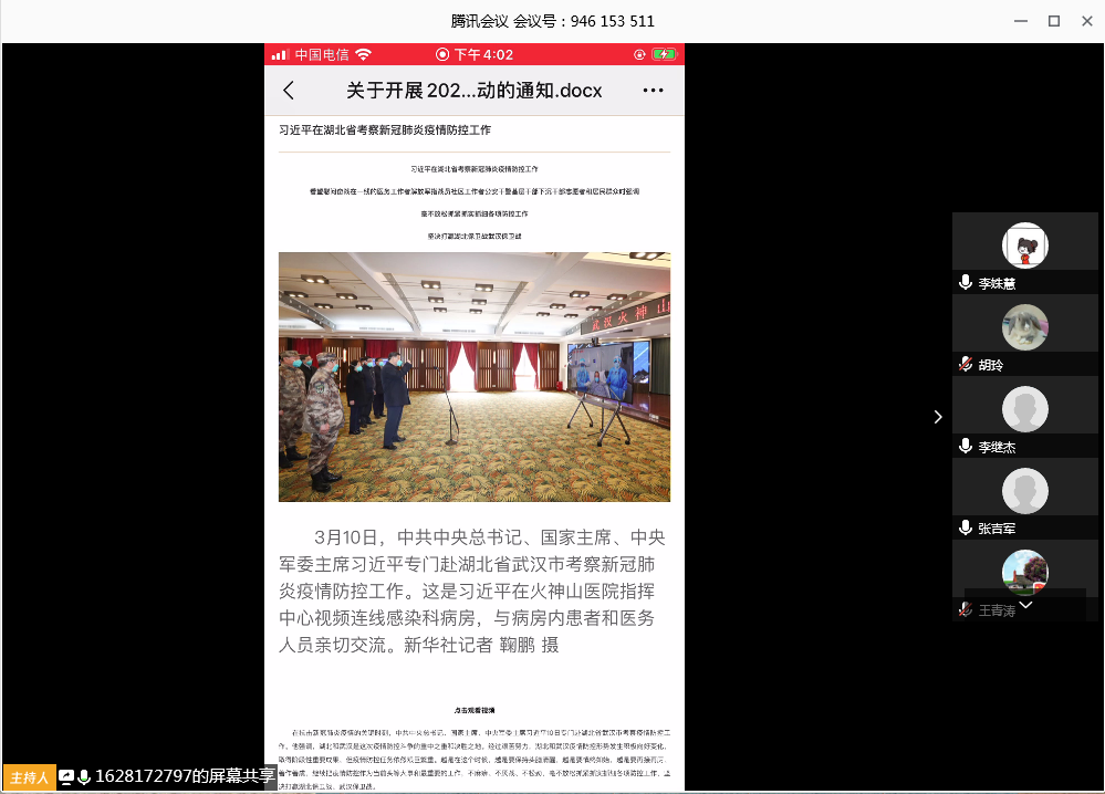 (通讯员:王青涛)3月26日下午16点,院直党支部利用腾讯会议平台,开展“坚持不懈、坚持打赢疫情防控和扶贫攻坚狙击战”线上主题党日学习活动,活动由党支部书记高秋丽主持,支部成员全部到会参加学习。