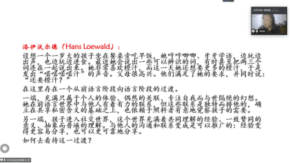 随后,吴老师从我们前语言阶段到语言阶段讲解情绪问题。吴老师提到了当代著名的精神分析界的重要人物洛伊沃尔德,并用小孩咿呀学语阶段需要橙汁的例子说明存在由前语言阶段到语言阶段的过渡,为引出“烫手的山芋”和“好好说话”做铺垫。