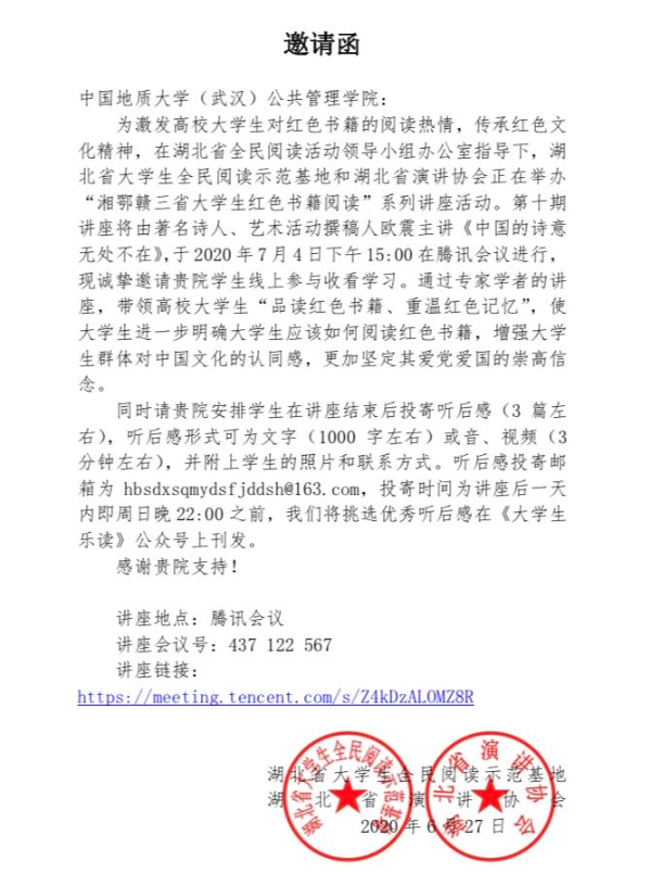 为庆祝中国共产党成立99周年,增强太阳成学子爱党爱国情怀,7月4日下午,太阳成150余名同学参加欧震老师线上红色书籍阅读专题讲座。讲座上,同学们认真听讲,积极互动,和欧震老师一起徜徉在诗歌的海洋里感悟中国之美。