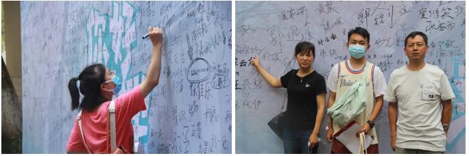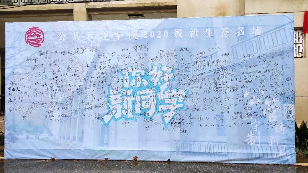 新生完成报到手续后,纷纷在公管学院的定制签名墙上留下自己的名字并合影留念。
