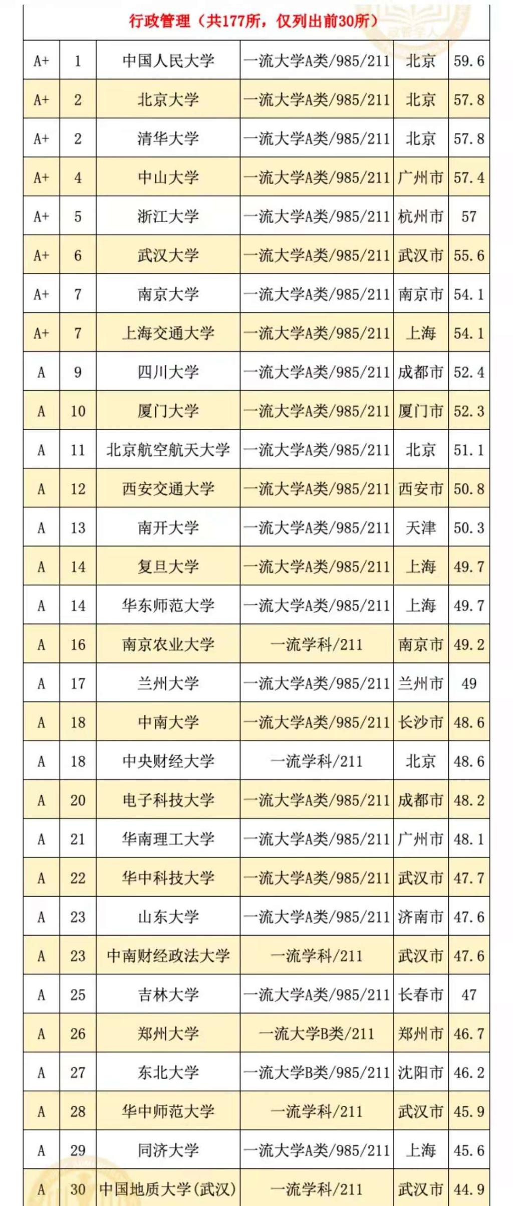 太阳成公共事业管理专业居全国前14%(29/206),行政管理专业居全国前17%(30/175),皆入选国家级A类专业,其中行政管理已入选国家一流本科专业。