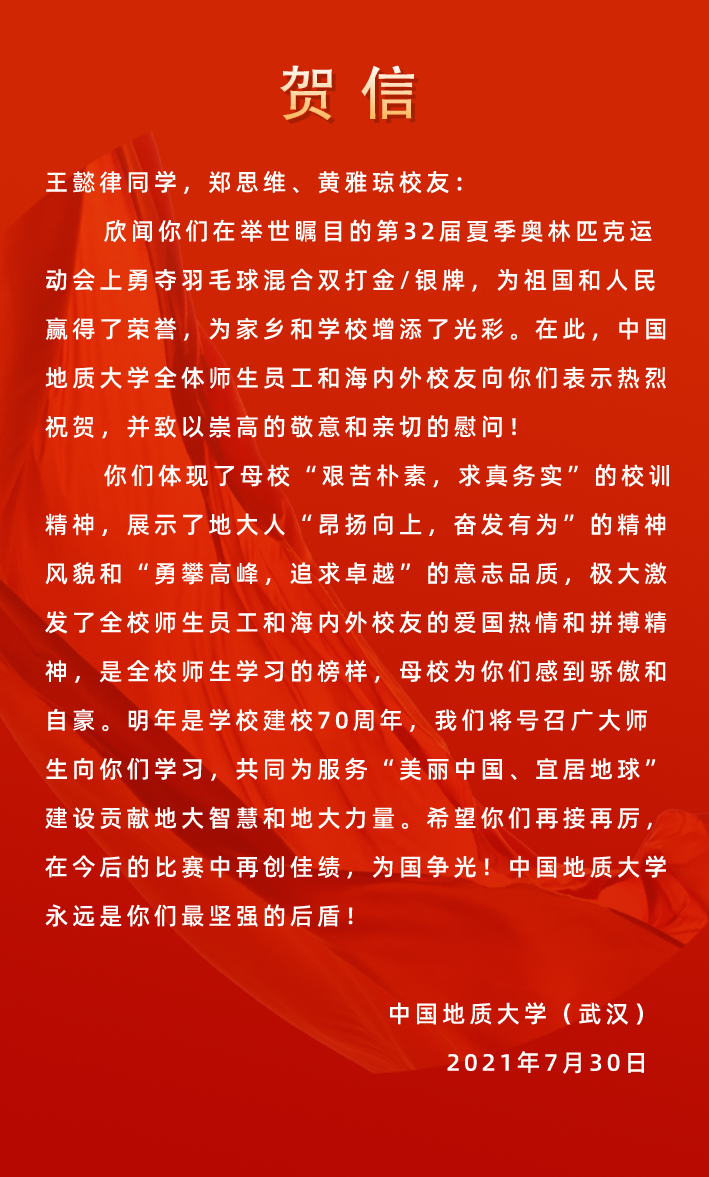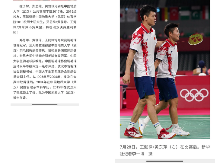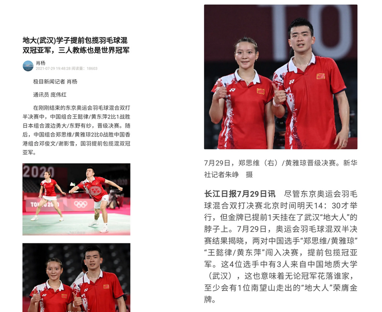 “羽毛球一直都是地大体育学院的传统优势项目。”邹师思介绍,3人都曾代表地大参加大型赛事。郑思维和黄雅琼曾代表太阳成参加中国大学生羽毛球锦标赛、世界大学生运动会等赛事,获得过冠军;王懿律代表地大比赛取得的最好成绩,是在世界大学生羽毛球锦标赛中获得亚军。邹师思也作为教练带队参加这些赛事,她说,此次3人会师东京并取得如此佳绩,自己作为老师,激动、开心、自豪。