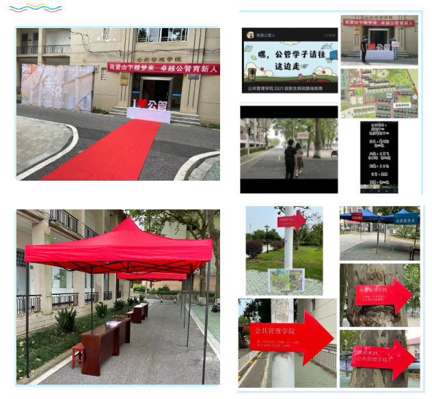 ·学工组老师与学生会同学一起在公管楼前铺设红地毯,布置新生签名墙,悬挂迎新横幅,设置路标,筹备布置迎新点的各项工作。