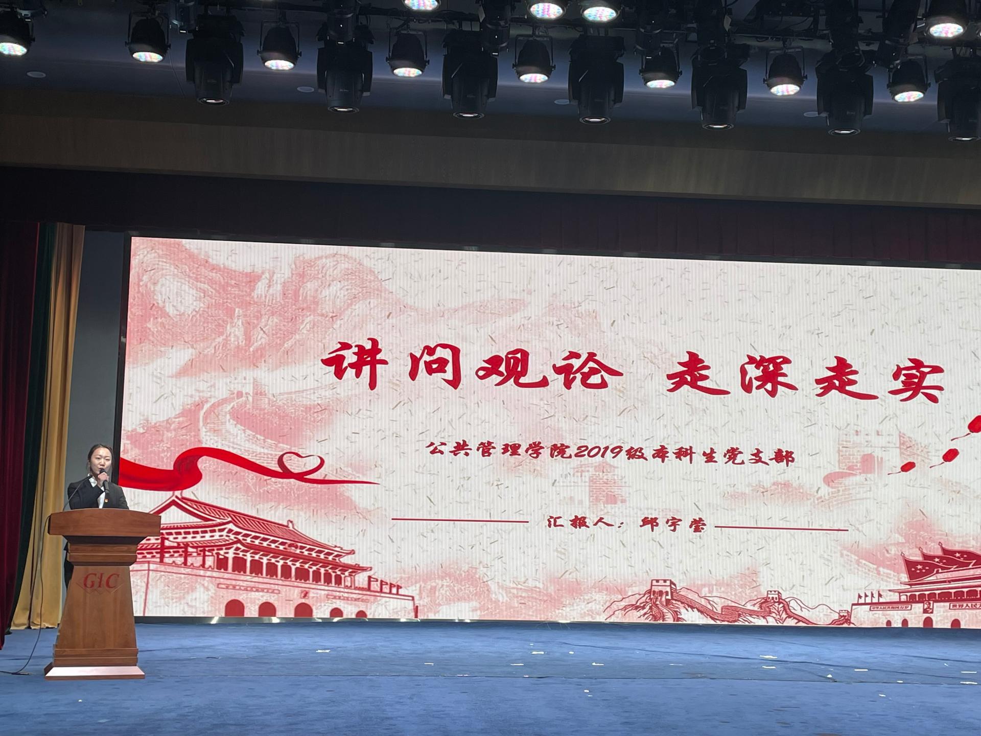 第二环节由11名同志进行5分钟的展演。展演紧紧围绕学习“七一”重要讲话精神,结合专业特色开展主题党日学习:胡学湉同志作为“土管人”,积极投身于自然资源合理利用和生态保护事业,参与长江大保护项目,为生态文明建设贡献一己之力;翟一帆同志作为“法学人”,他认为,在依法治国方略的统领下,以《长江保护法》为首的流域法、生态保护红线制度的配套法律等,都是法学领域为保护生态环境做出的积极响应;王晓旭同志作为“公管人”,谨记共同富裕的奋斗目标,作为新时代新青年在新的赶考路上,须勇担时代大任,争做推动早日实现第二个百年奋斗目标的先锋力量。最后,所有同志面向党旗,表达了“公立守制,管铸新风;请党放心,强国有我”的强大信心与决心。
