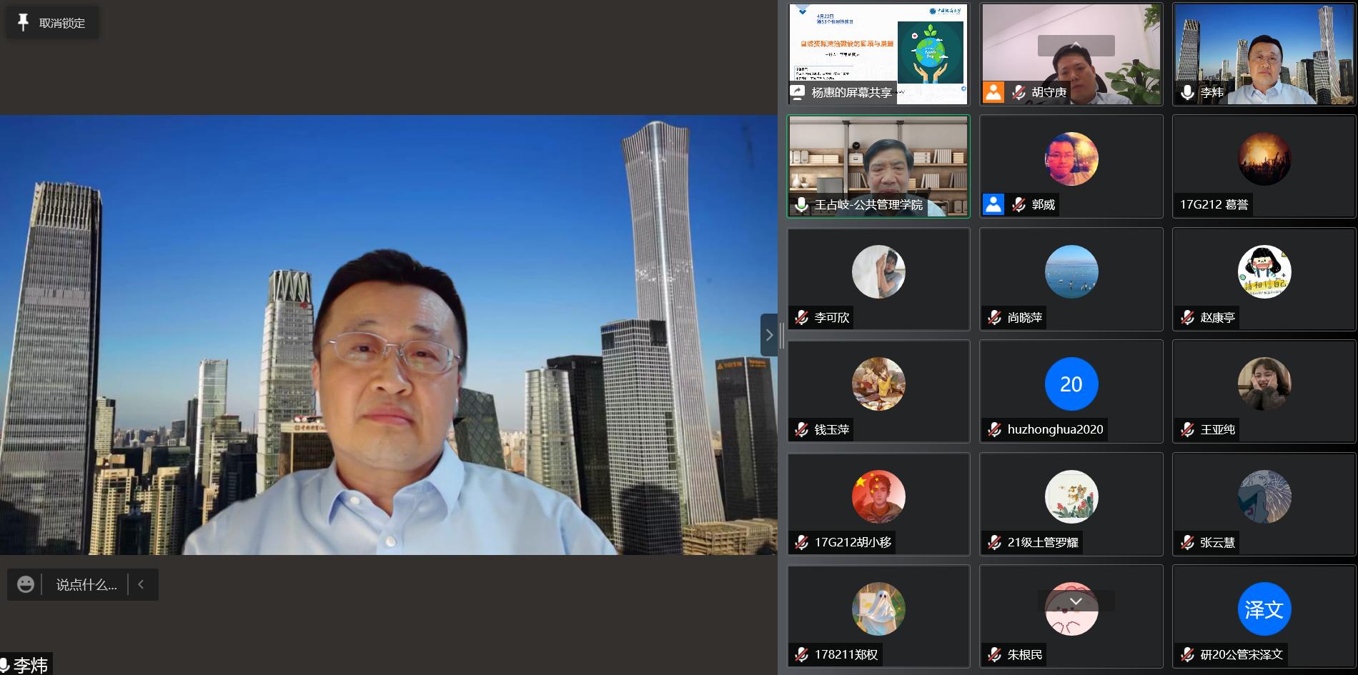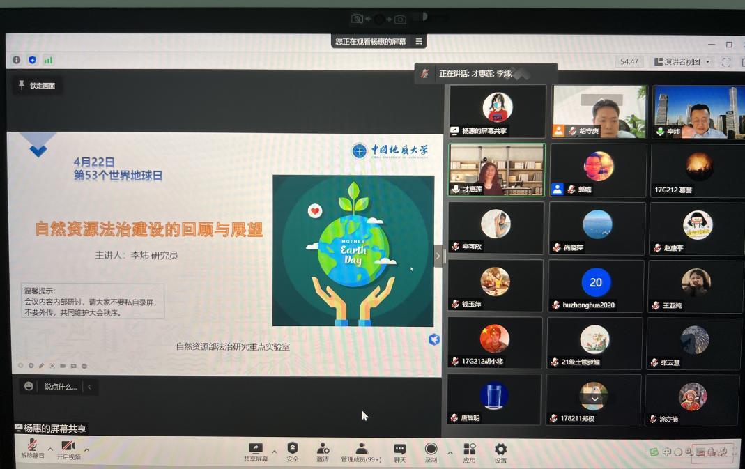 4月22日是第53个世界地球日,为深入学习宣传贯彻习近平生态文明思想,自然资源部法治研究重点实验室、122cc太阳集成游戏成功举办“422地球日”专题线上研讨会。校党委副书记唐辉明出席会议并致辞,自然资源部不动产登记中心(法律事务中心)副主任李炜以“自然资源法治建设的回顾与展望”为主题作专题报告,太阳成公管学院师生、自然资源部不动产登记中心相关人员参加了此次学术活动。122cc太阳集成游戏院长胡守庚主持会议。