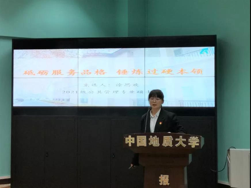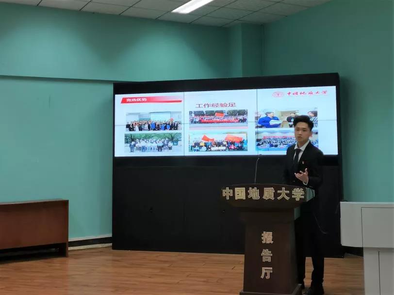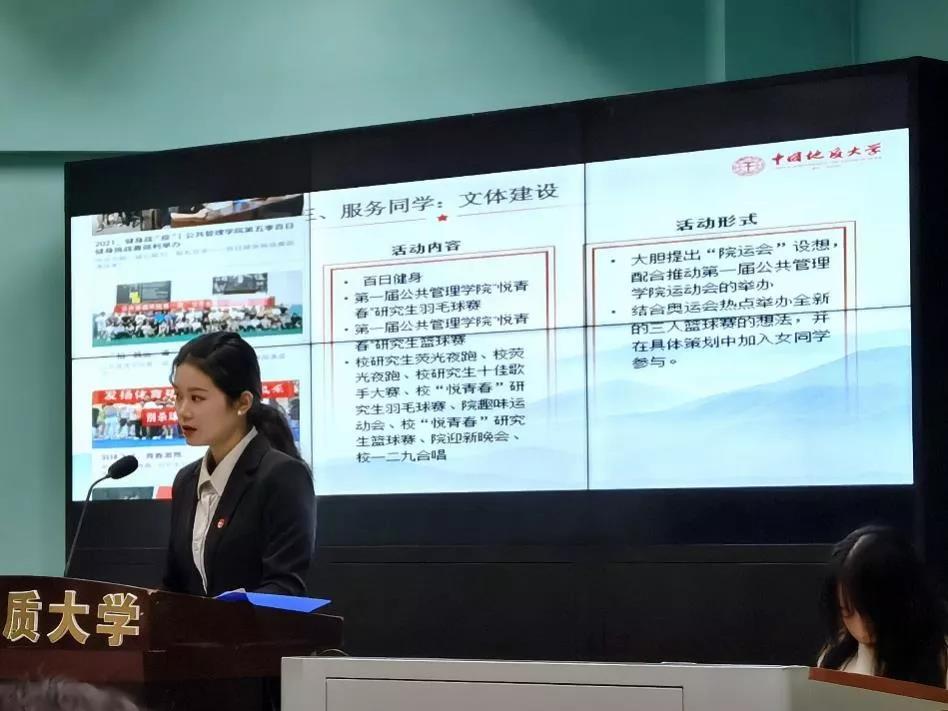 本次竞选采用5分钟PPT展示加3分钟现场提问的方式进行,共有五位候选人,分别是2021级公管专业研究生张少剑、2021级公管专业研究生廖鑫鑫、2021级法学专业研究生张育梅、2021级资源与环境专业研究生邢书宣和2021级公管专业研究生涂思欢同学。