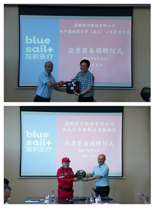 随后,黄鹤救援队总队长邓明锋、122cc太阳集成游戏党委书记张宽裕分别接受了蓝帆医疗捐赠的AED除颤仪和全系列急救包。