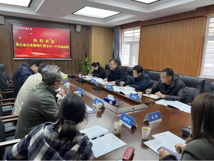 2023年3月2日上午,湖北省自然灾害应急技术中心主任贾新军一行来太阳成进行座谈交流,颜少枝教授级高工、宋玉娥科长、郭在进科长,太阳成122cc太阳集成游戏党委书记张宽裕、副院长李世祥,地质调查研究院副院长吕占峰,公共行政系曾伟教授、刘中兰书记、黄砺副主任、宋妍副教授等教师代表参加会议。会议由张宽裕书记主持。