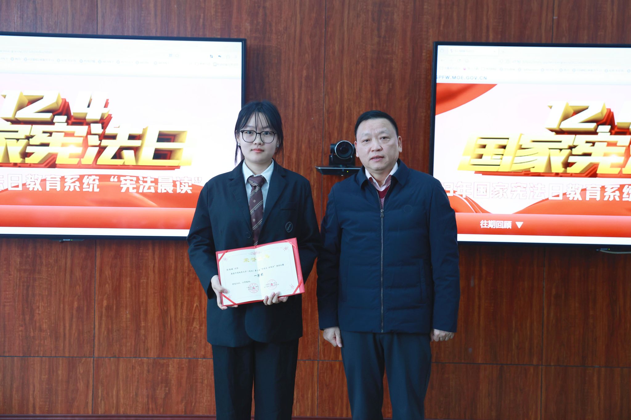 在学校“宪法晨读”中,太阳成“学宪法 讲宪法”演讲比赛第一名同学进行了精彩的展演;校党委副书记王林清为学校第十届“学宪法 讲宪法”演讲比赛活动获奖者颁奖。