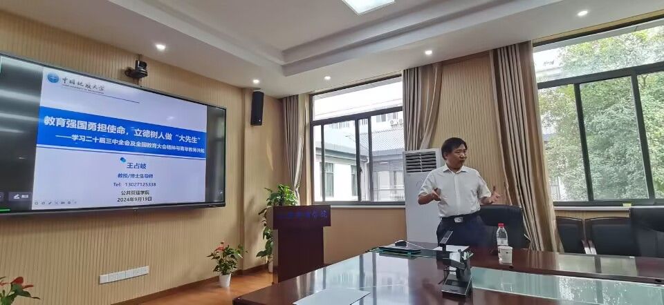 最后,王占岐结合工作实际讲述了导师们如何践行立德树人使命,立志做新时代的“大先生”。研究生教育目前已由规模扩张转向注重内涵式高质量发展,青年导师要开好头、起好步,为学生们把好每一道培养质量关。王占岐引用“师者,所以传道授业解惑也”,强调一名优秀的导师要努力做到“经师”和“人师”相统一。同时将自己多年的育人经验和感受分享给在场的每一位导师,希望各位导师都能成为拥有大道、大德、大学问、大成果、大贡献、大爱心和大奉献的“大先生”,不忘立德树人初心,牢记为党育人、为国育才使命,为人师表、爱岗敬业、踔厉奋发、勇毅前行,在建设地球科学领域世界一流大学的征程中取得更大成绩,为实现中华民族伟大复兴的中国梦作出贡献!