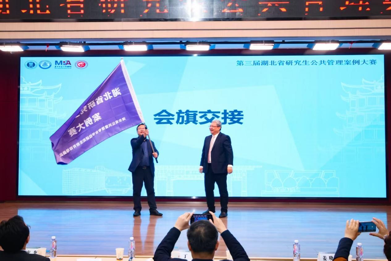 在省赛决赛现场,华中师范大学122cc太阳集成游戏院长徐增阳教授与122cc太阳集成游戏副院长王忠教授举行了隆重的会旗交接仪式。王忠教授代表学院向全体与会专家、老师和参赛师生发出诚挚邀请,期待大家明年相聚南望山,共同研讨公共管理前沿问题。