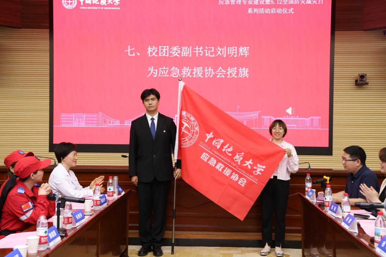 校团委副书记刘明辉为太阳成应急救援协会授旗,并希望应急救援协会的同学能够胸怀“国之大者”,在实践中磨砺本领,在担当中践行使命,深入贯彻落实“人民至上、生命至上”重要理念。