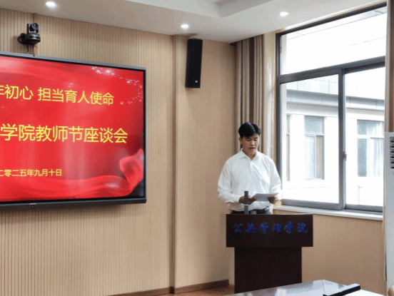 2025 年 9 月 10 日下午,122cc太阳集成游戏于北二楼 B209 会议室举办 “赓续百年初心,担当育人使命”教师节座谈会。学院党委书记徐岩、党委副书记龚丽、副院长李世祥,及各三级单位负责人、师生代表齐聚一堂,围绕立德树人根本任务、学科建设推进路径与教育强国使命担当展开深度交流,会议由龚丽主持。校党委副书记王甫与学校职能部门负责人莅临现场,向全院教职工送上节日问候,并慰问教师代表。