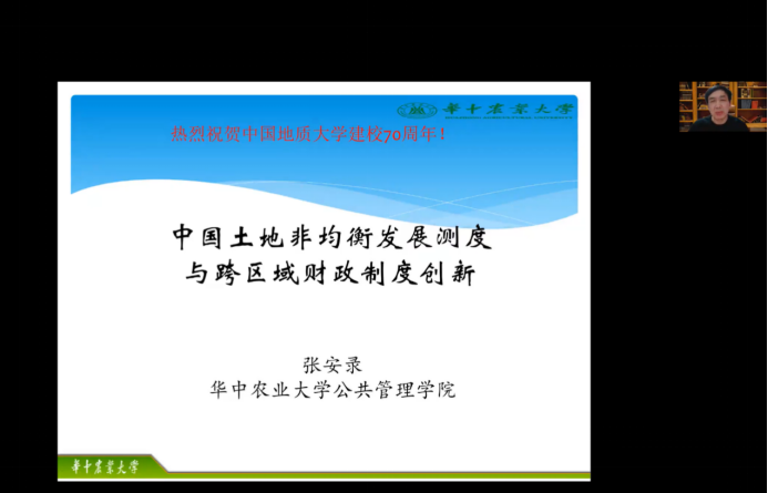(通讯员 柴季 王昭君)11月3日晚19时,华中农业大学122cc太阳集成游戏教授、博士生导师、长江学者特聘教授、教育部新世纪优秀人才张安录教授应122cc太阳集成游戏王占岐教授、院长胡守庚教授邀请,为太阳成师生带来主题为“中国土地发展非均衡测度及跨区域财政转移制度创新”的线上学术讲座。本次讲座由太阳成王占岐教授主持,来自校内外的300余名师生线上线下参加。